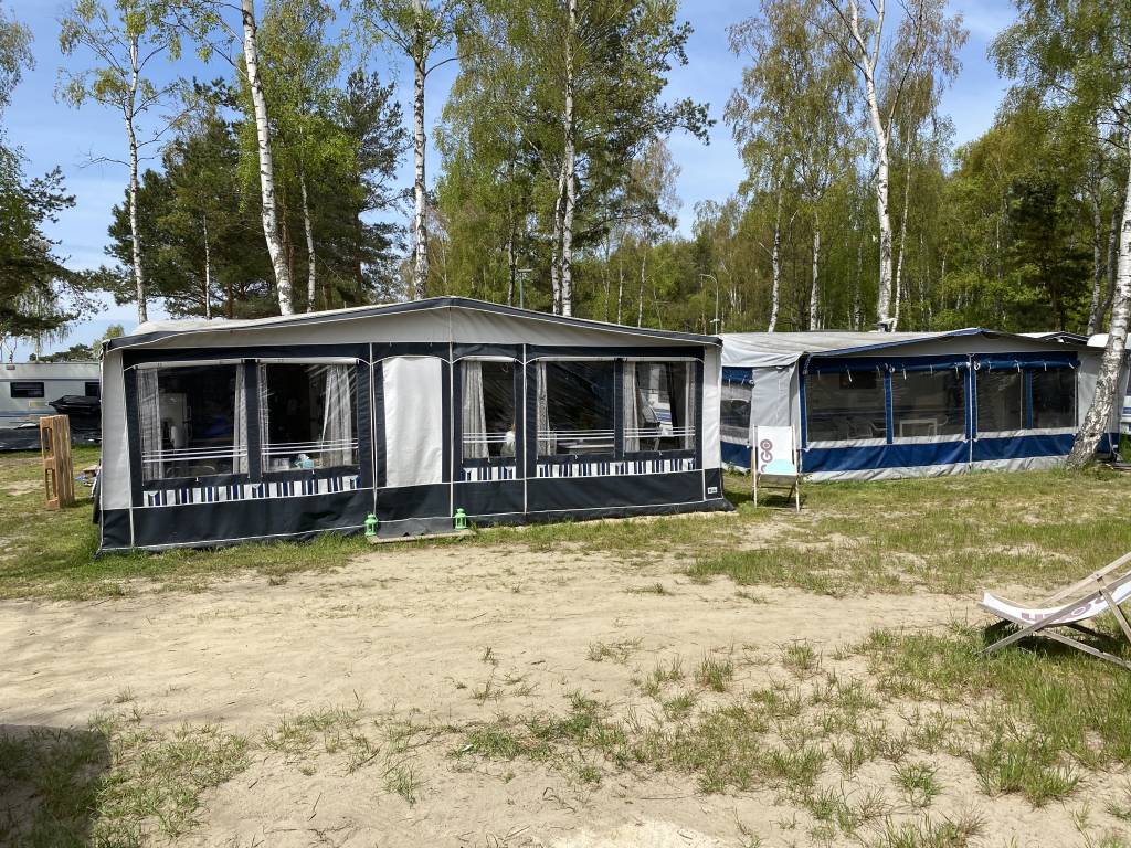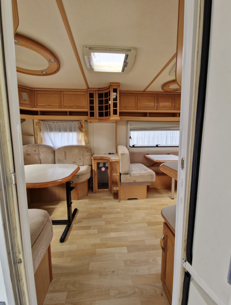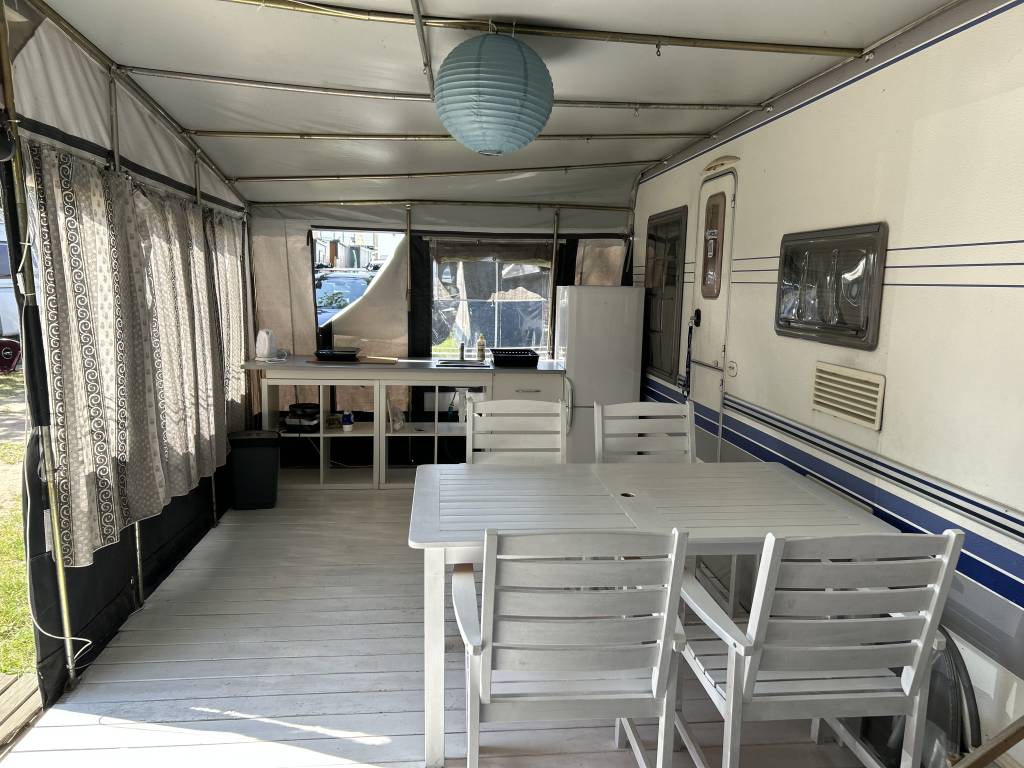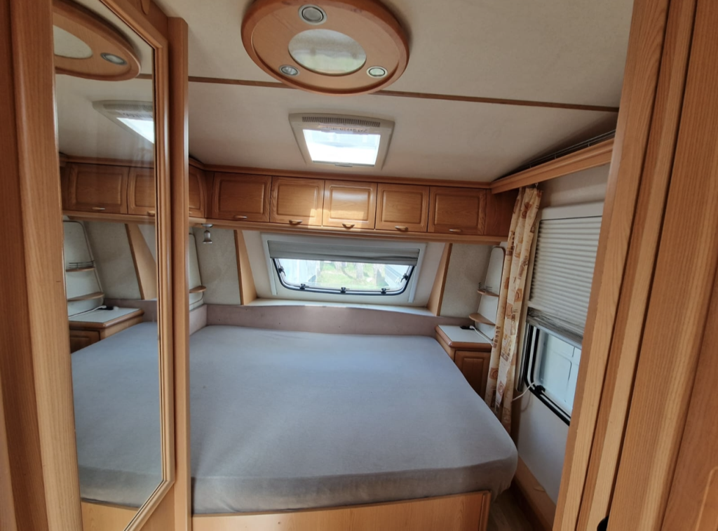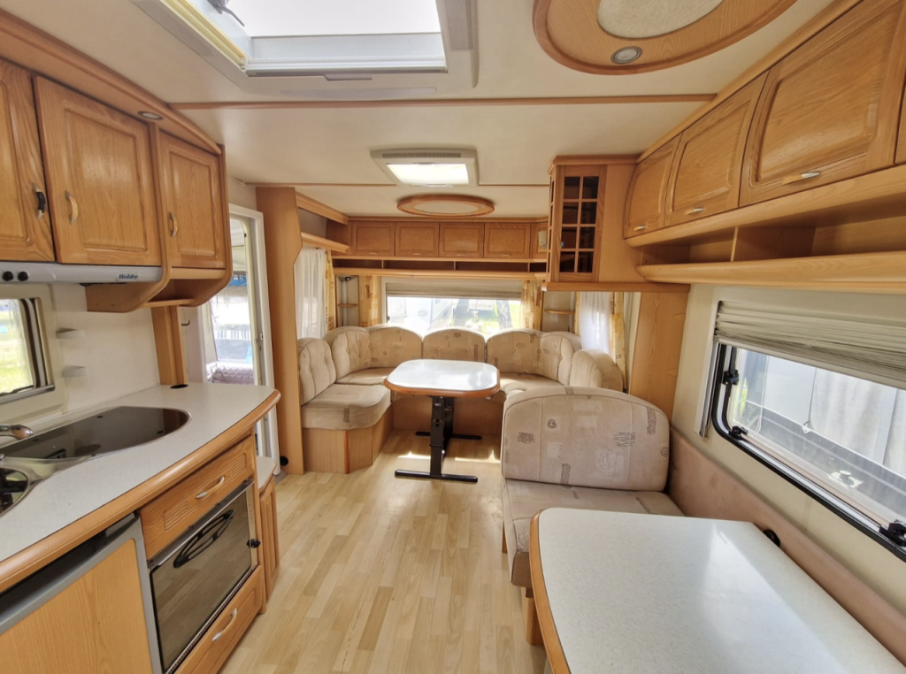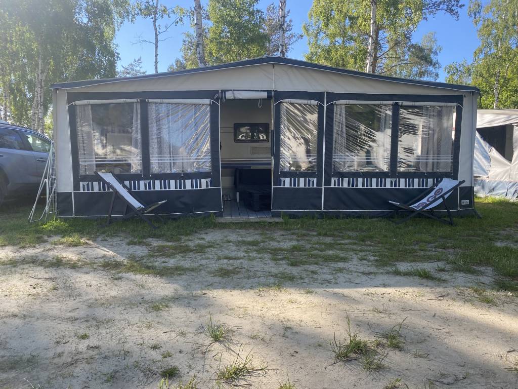Przyczepa 4-5 osobowa, posiada dwie części sypialne, każda z podwójnym łóżkiem (oddzieloną drzwiami sypialnię z łóżkiem małżeńskim , salon z kanapą i stolikiem, które zamieniają się w podwójne łóżko),oprócz tego jedno łóżko jednoosobowe .W przyczepie łazienka w niej umywalka i toaleta z wc chemicznym.Aneks kuchenny, kuchenka trzy palniki, piekarnik,lodówka,zlew.
