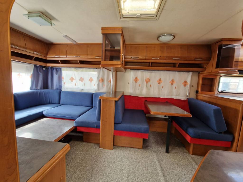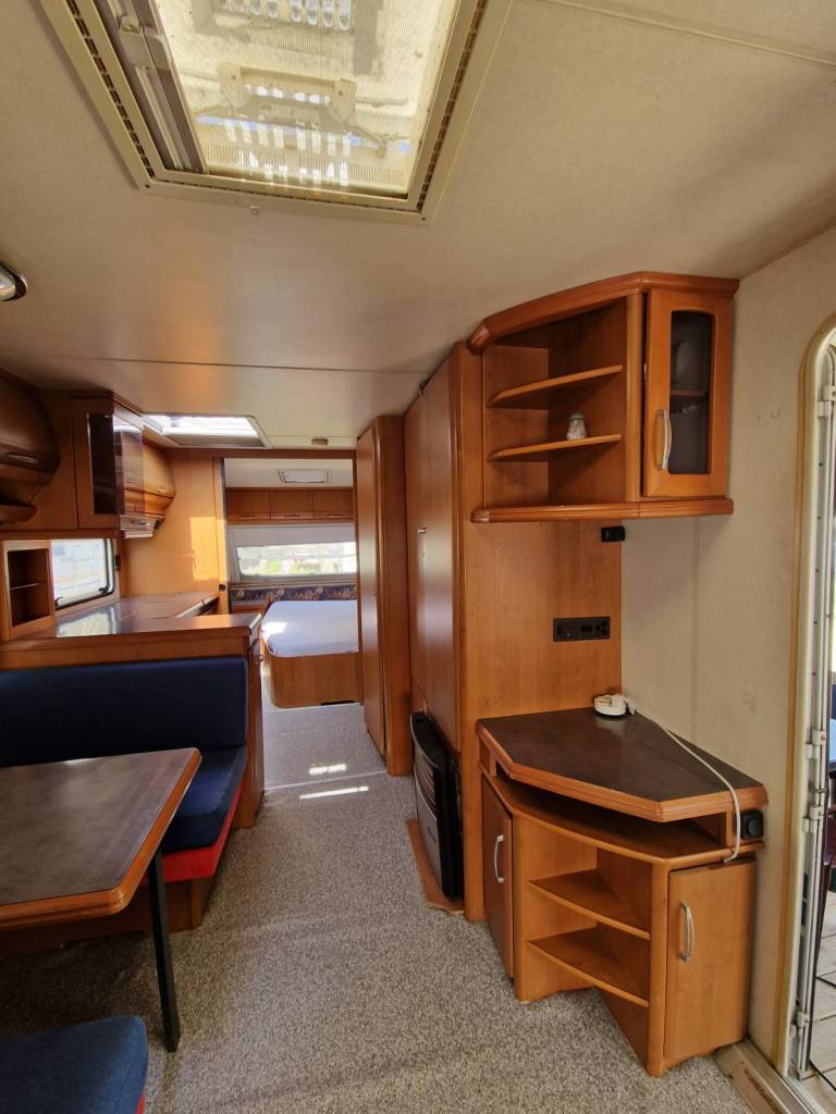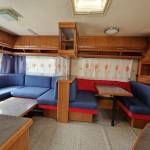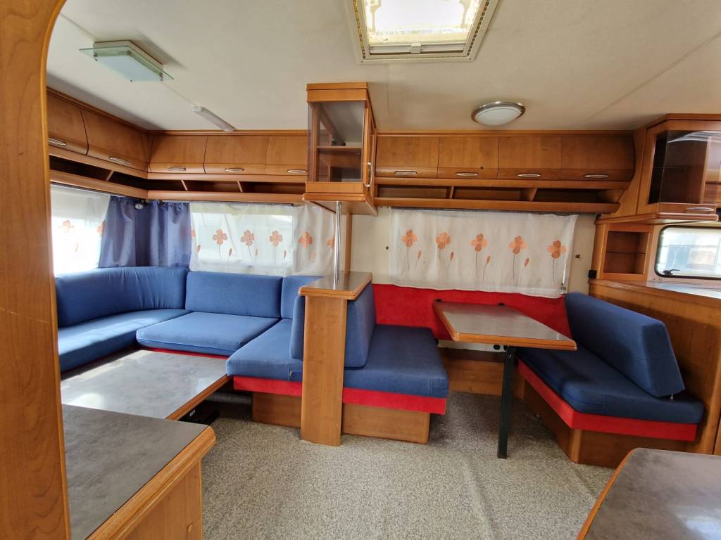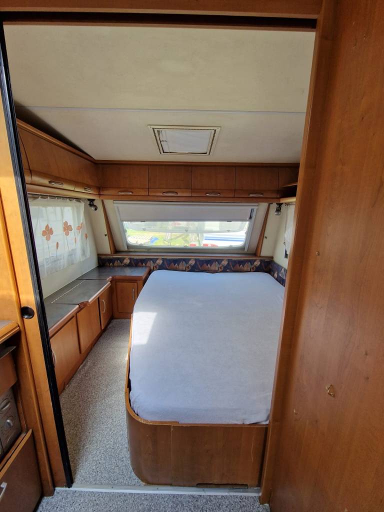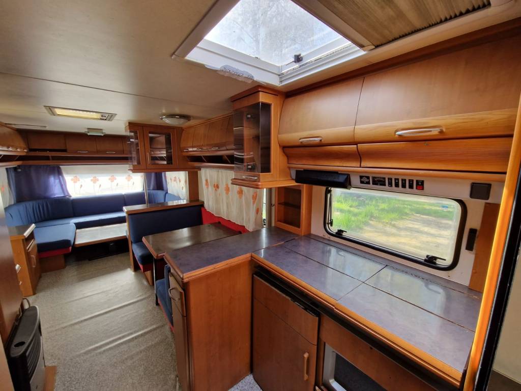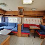 Przyczepa 5-6 osobowa, posiada dwie części sypialne, każda z podwójnym łóżkiem (oddzieloną drzwiami sypialnię z łóżkiem małżeńskim , salon z kanapą i stolikiem, które zamieniają się w trzyosobowe łóżko),oprócz tego jedno łóżko jednoosobowe .W przyczepie łazienka w niej umywalka i toaleta z wc chemicznym.Aneks kuchenny, kuchenka trzy palniki, kuchenka mikrofalowa,lodówka,zlew.